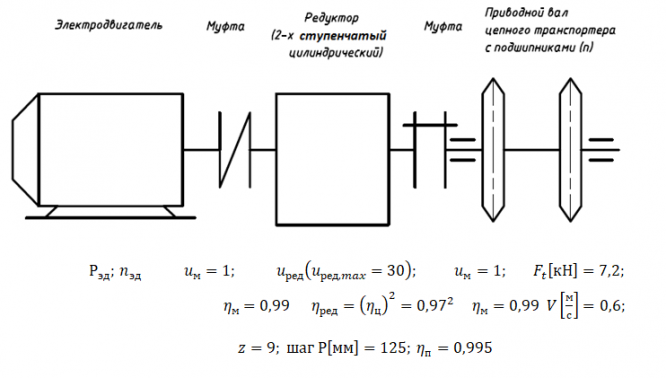 Цепной транспортер - машина, предназначенная для непрерывного горизонтального перемещения штучных грузов, устанавливаемая в отапливаемом помещении. 1.Кинематический расчет привода