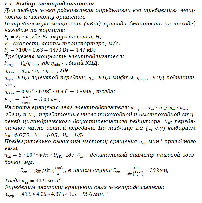 Для проектирования цепного транспортера, прежде всего, необходимо выбрать электродвигатель. Для этого определяем мощность, потребляемую движущим устройством, оцениваем КПД привода. Далее уточняем передаточные отношения редуктора, подсчитываем вращающие моменты на валах привода. Таким образом, будут определены исходные данные для расчета передач.