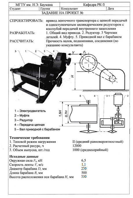 Для студентов МГТУ им. Н.Э.Баумана по предмету Детали машин (ДМ)КП №6. Привод ленточного транспортера с цепной передачей и одноступенчатым цилиндрическим редуктором с косозубой передачей внутреннего зацепленияКП №6. Привод ленточного транспортера с цепной передачей и одноступенчатым цилиндрическим редуктором с косозубой передачей внутреннего зацепления