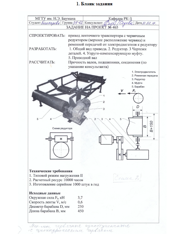 Главная » Учебные материалы » Детали машин (ДМ) » Курсовые работы » МГТУ им. Н.Э.Баумана » 6 семестр » Номер ДМ » Вариант 465 » Привод ленточного транспортера с червячным редуктором (верхнее расположение червяка) и ременной передачей от электродвигателя к редуктору (задание №465)