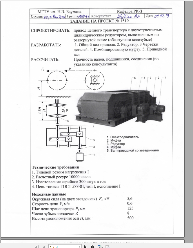 Главная » Учебные материалы » Детали машин (ДМ) » Курсовые работы » МГТУ им. Н.Э.Баумана » 6 семестр » Номер ДМ » Вариант 1519 » ДМ №1519 - Проектирование привода цепного транспортера с двухступенчатым цилиндрическим редуктором, выполненным по развернутой схем