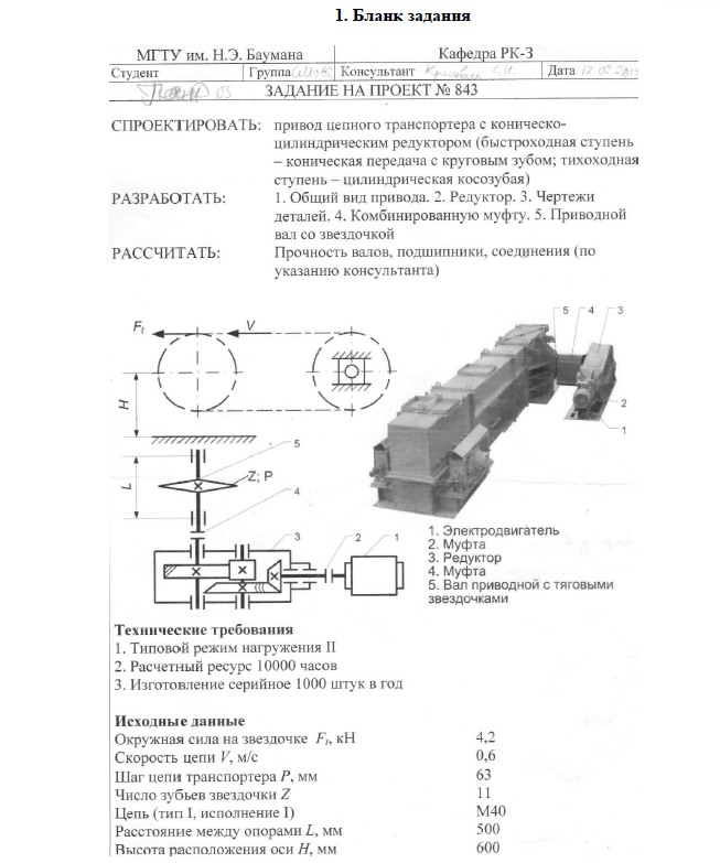 Для студентов МГТУ им. Н.Э.Баумана по предмету Детали машин (ДМ)Привод цепного транспортера с коническо-цилиндрическим редуктором (быстроходная ступень – коническая передача с круговым зубом, тихоходная ступень – цПривод цепного транспортера с коническо-цилиндрическим редуктором (быстроходная ступень – коническая передача с круговым зубом, тихоходная ступень – ц