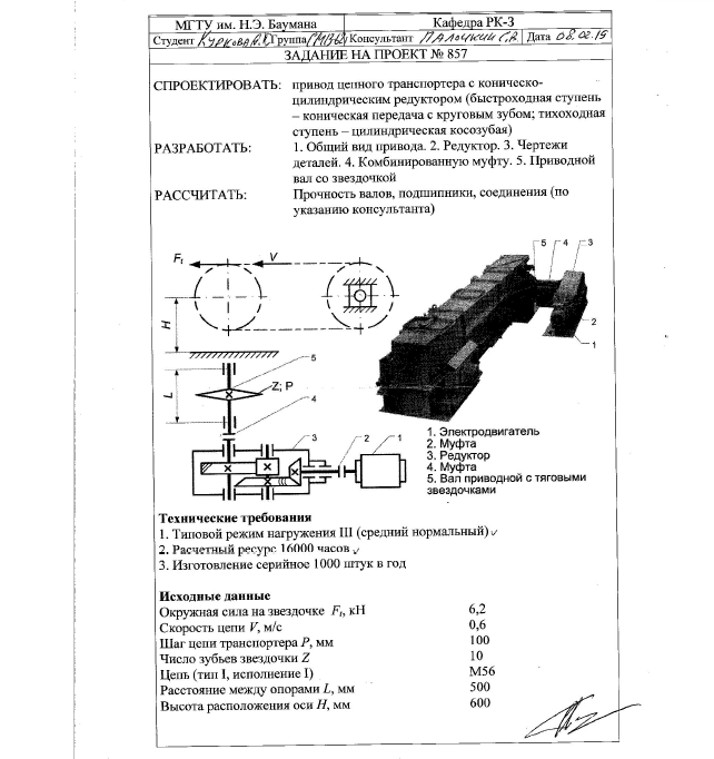 Для студентов МГТУ им. Н.Э.Баумана по предмету Детали машин (ДМ)Привод цепного транспортера с коническо-цилиндрическим редуктором (задание №857)Привод цепного транспортера с коническо-цилиндрическим редуктором (задание №857)
