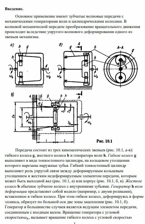 Передача состоит из трех кинематических звеньев (рис. 10.1, а-в): гибкого колеса g, жесткого колеса b и генератора волн h. Гибкое колесо g выполняют в виде тонкостенного цилиндра, на кольцевом утолщении которого нарезаны наружные зубья. Гибкий тонкостенный цилиндр выполняет роль упругой связи между деформируемым кольцевым утолщением и жестким недеформируемым элементом передачи, которым может быть выходной вал (рис. 10.1, а) или корпус (рис. 10.1, б, в). Жесткое колесо b обычное зубчатое колесо с внутренними зубьями. Генератор h волн деформации представляет собой водило (например, с двумя роликами), вставленное в гибкое колесо. При этом гибкое колесо, деформируясь в форме эллипса, образует по большой оси две зоны зацепления (рис. 10.1, б). Генератор в большинстве случаев является ведущим элементом передачи, соединенным с входным валом. Вращение генератора с угловой скоростьюℎ, вызывает вращение гибкого колеса с угловой скоростью3 (рис. 10.1,a) или жесткого колеса с (рис. 10.1, б, в). Передаточное отношение u волновой передачи при: