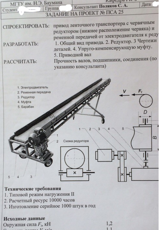 Главная » Учебные материалы » Детали машин (ДМ) » Курсовые работы » МГТУ им. Н.Э.Баумана » 6 семестр » Номер ПСА » Вариант 25 » ДМ № ПСА 25 - Привод ленточного транспортера с червячным редуктором (нижее расположение червяка) и ременной передачей от электродвигателя к редуктору