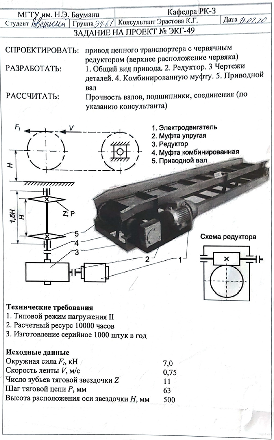 Для студентов МГТУ им. Н.Э.Баумана по предмету Детали машин (ДМ)Привод цепного транспортера с червячным редуктором ЭКГ 49Привод цепного транспортера с червячным редуктором ЭКГ 49