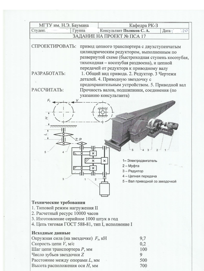 Для студентов МГТУ им. Н.Э.Баумана по предмету Детали машин (ДМ)ДМ № ПСА 17 - Проектирование привода цепного транспортера с двухступенчатым цилиндрическим редуктором выполненным по развернутой схемеДМ № ПСА 17 - Проектирование привода цепного транспортера с двухступенчатым цилиндрическим редуктором выполненным по развернутой схеме