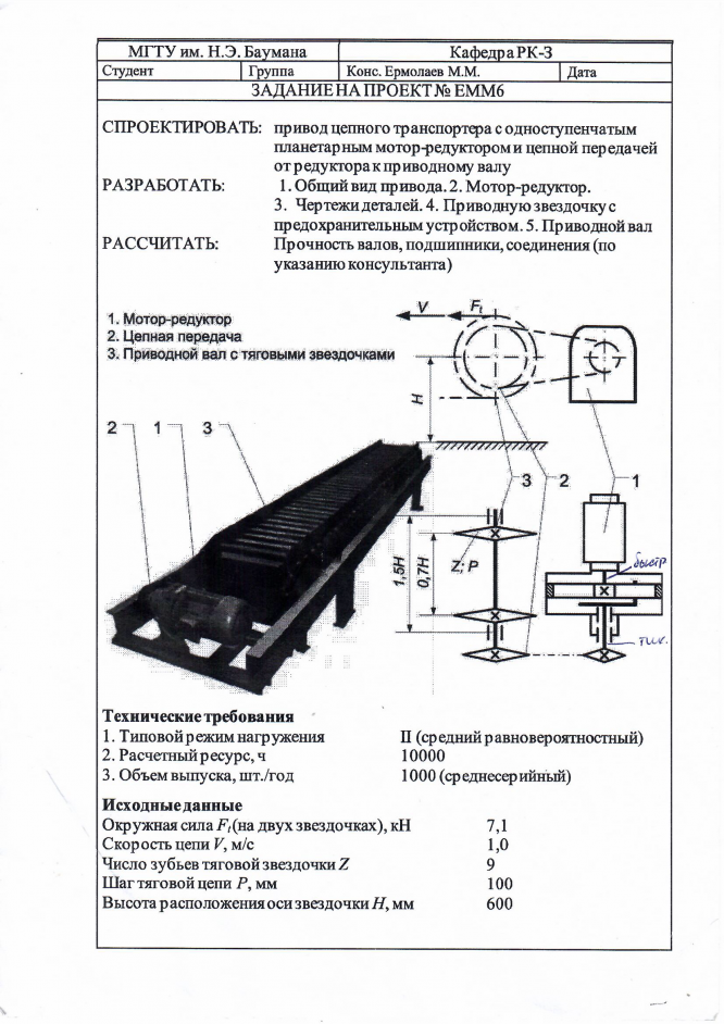 КП №6. Привод ленточного транспортера с цепной передачей и одноступенчатым цилиндрическим редуктором с косозубой передачей внутреннего зацепления