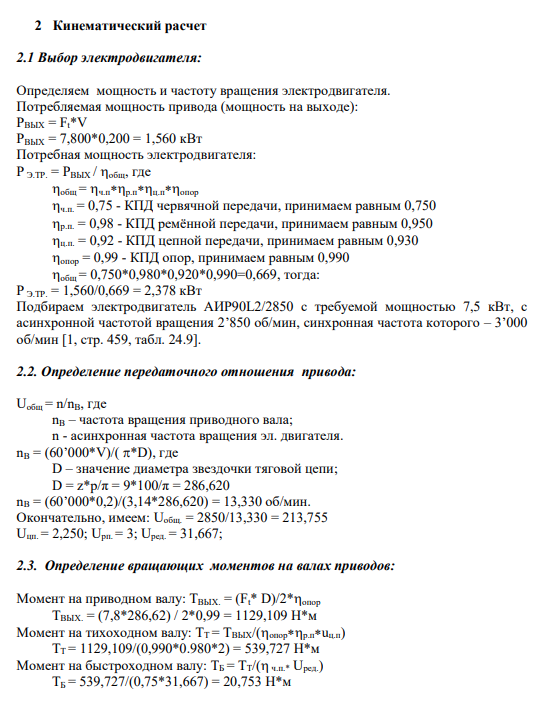 Цепной транспортёр предназначен для непрерывной горизонтальной транспортировки различных грузов. Движение цепи осуществляется посредством двух звёздочек, установленных на приводном валу. Передача вращения на него осуществляется посредством червячного редуктора с верхним расположением червяка и асинхронного электродвигателя 90L2 исполнения IM 1081, сообщающихся посредством ремённой передачи, а также цепной передачи, соединяющей тихоходный вал редуктора с приводным валом. Электропитание осуществляется от сети переменного 3-х фазного тока с частотой 50 Гц и напряжением 380 В. II типовой режим нагружения. Расчётный ресурс 10’000 ч. Изготовление серийное – 1’000 штук в год.