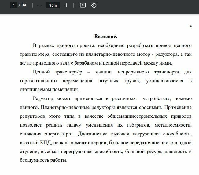 В рамках данного проекта, необходимо разработать привод цепного транспортёра, состоящего из планетарно-цевочного мотор - редуктора, а так же из приводного вала с барабаном и цепной передачей между ними. Цепной транспортёр – машина непрерывного транспорта для горизонтального перемещения штучных грузов, устанавливаемая в отапливаемом помещении. Редуктор может применяться в различных устройствах, помимо данного. Планетарно-цевочные редукторы являются соосными. Применение редукторов этого типа в качестве общемашиностроительных приводов позволяет решить задачу уменьшения их габаритов, металлоемкости, снижения энергозатрат. Достоинства: высокая нагрузочная способность, высокий КПД, низкий момент инерции, большое передаточное число в одной ступени, высокая перегрузочная способность, большой ресурс, плавность и бесшумность работы.