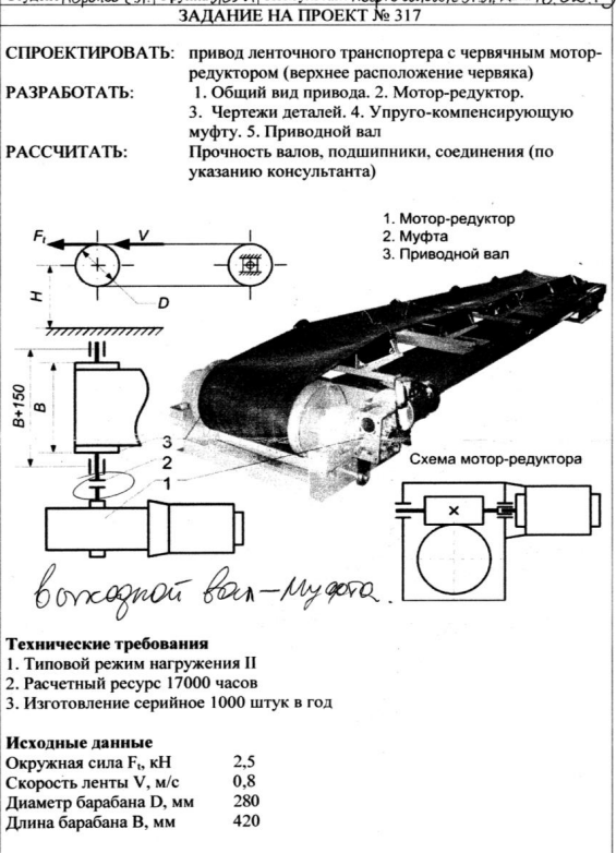 Курсовая работа ДМ: ДМ 317 - Привод ленточного транспортера с червячным мотор-редуктором (верхнее расположение червяка) вариант 317