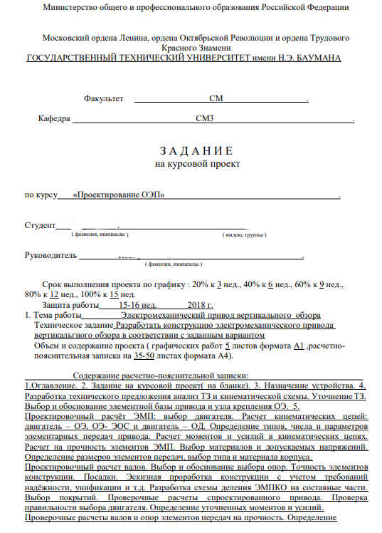 2. Задание на курсовой проект( на бланке). 3. Назначение устройства. 4. Разработка технического предложения анализ ТЗ и кинематической схемы. Уточнение ТЗ. Выбор и обоснование элементной базы привода и узла крепления ОЭ. 5. Проектировочный расчёт ЭМП: выбор двигателя. Расчет кинематических цепей: двигатель – ОЭ, ОЭ- ЭОС и двигатель – ОД. Определение типов, числа и параметров элементарных передач привода. Расчет моментов и усилий в кинематических цепях. Расчет на прочность элементов ЭМП. Выбор материалов и допускаемых напряжений. Определение размеров элементов передач, выбор типа и материала корпуса. Проектировочный расчет валов. Выбор и обоснование выбора опор. Точность элементов конструкции. Посадки. Эскизная проработка конструкции с учетом требований надёжности, унификации и т.д. Разработка схемы деления ЭМПКО на составные части. Выбор покрытий. Проверочные расчеты спроектированного привода. Проверка правильности выбора двигателя. Определение уточненных моментов и усилий. Проверочные расчеты валов и опор элементов передач на прочность.