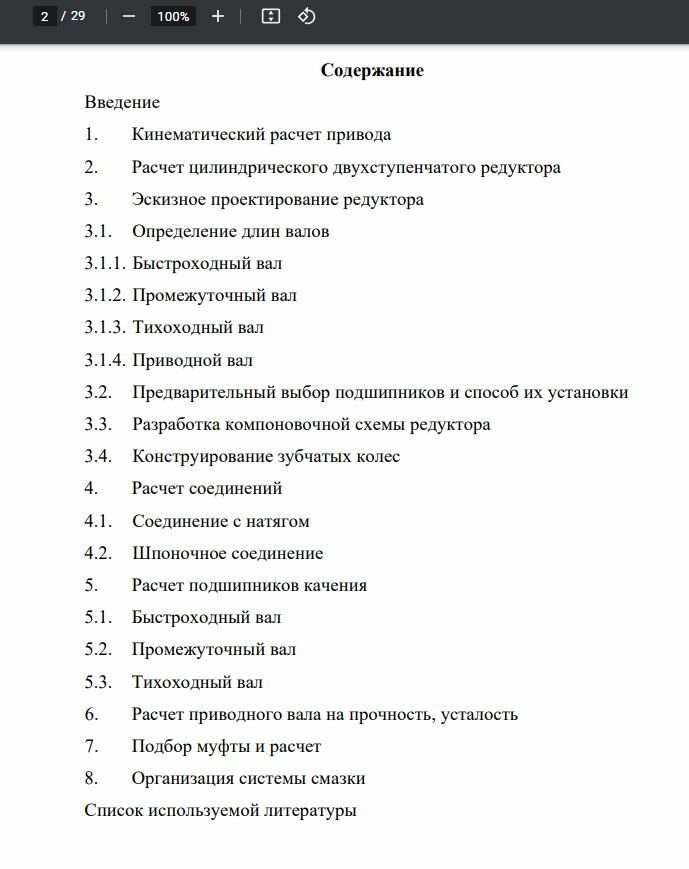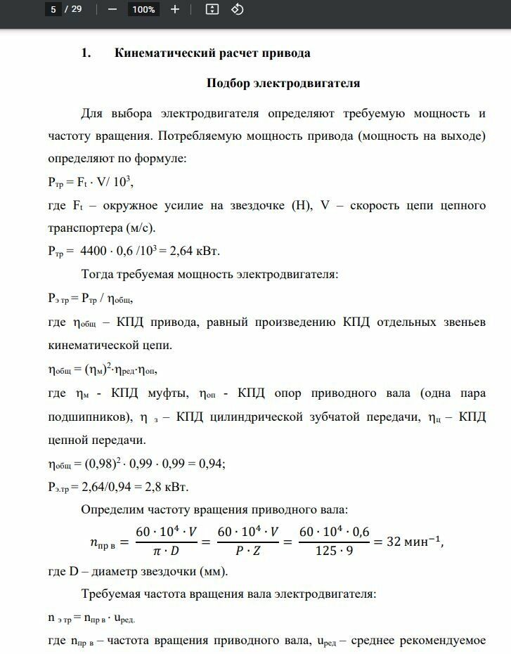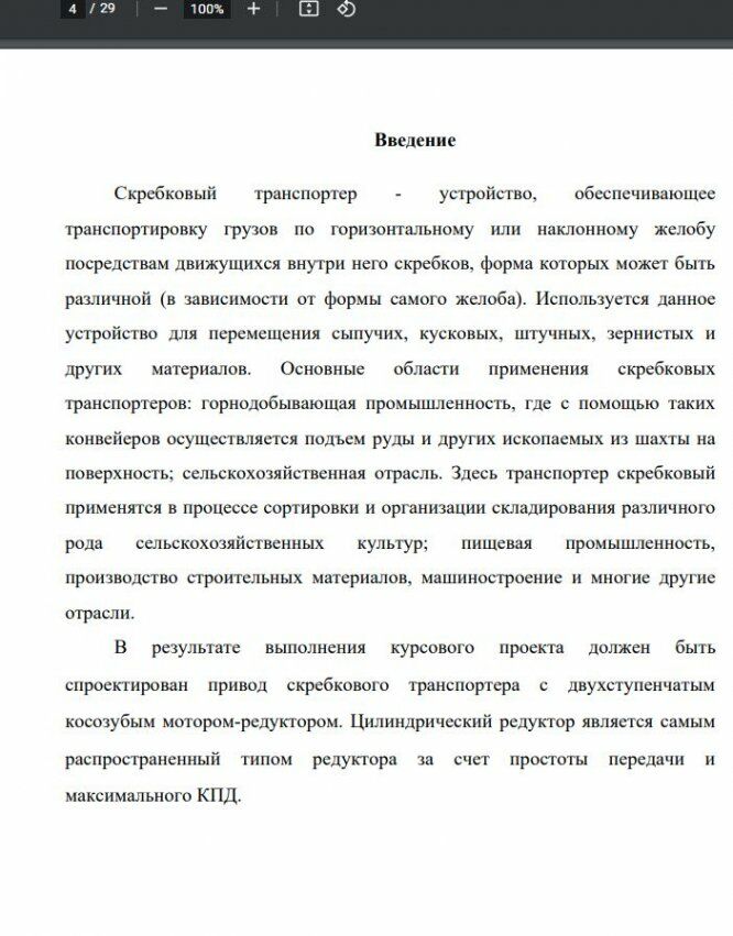 Скребковый транспортер - устройство, обеспечивающее транспортировку грузов по горизонтальному или наклонному желобу посредствам движущихся внутри него скребков, форма которых может быть различной (в зависимости от формы самого желоба). Используется данное устройство для перемещения сыпучих, кусковых, штучных, зернистых и других материалов. Основные области применения скребковых транспортеров: горнодобывающая промышленность, где с помощью таких конвейеров осуществляется подъем руды и других ископаемых из шахты на поверхность; сельскохозяйственная отрасль. Здесь транспортер скребковый применятся в процессе сортировки и организации складирования различного рода сельскохозяйственных культур; пищевая промышленность, производство строительных материалов, машиностроение и многие другие отрасли. В результате выполнения курсового проекта должен быть спроектирован привод скребкового транспортера с двухступенчатым косозубым мотором-редуктором. Цилиндрический редуктор является самым распространенный типом редуктора за счет простоты передачи и максимального КПД.