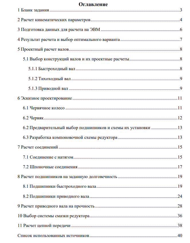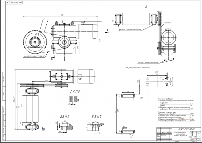 В результате проделанной работы спроектирован привод ленточного транспортера с червячным редуктором (верхнее расположение червяка), ременной передачей от электродвигателя к редуктору. Разработаны чертеж общего вида привода, сборочный чертеж редуктора, чертежи червяка, червячного колеса, крышки и ведущей звездочки, а также сборочный чертеж приводного вала. Рассчитан вал привода на статическую прочность и на сопротивление усталости, подшипники на заданный ресурс, шпоночные соединения на прочность. Выполненные расчеты подтверждают надежность работы привода в течение 10000 часов.