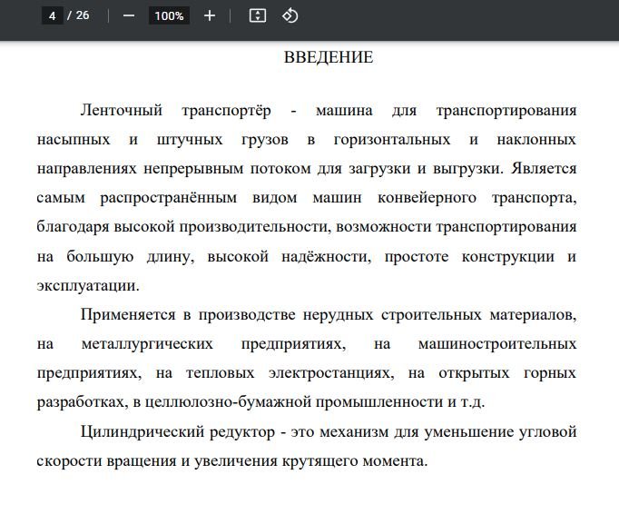 Ленточный транспортёр - машина для транспортирования насыпных и штучных грузов в горизонтальных и наклонных направлениях непрерывным потоком для загрузки и выгрузки. Является самым распространённым видом машин конвейерного транспорта, благодаря высокой производительности, возможности транспортирования на большую длину, высокой надёжности, простоте конструкции и эксплуатации. Применяется в производстве нерудных строительных материалов, на металлургических предприятиях, на машиностроительных предприятиях, на тепловых электростанциях, на открытых горных разработках, в целлюлозно-бумажной промышленности и т.д. Цилиндрический редуктор - это механизм для уменьшение угловой скорости вращения и увеличения крутящего момента.