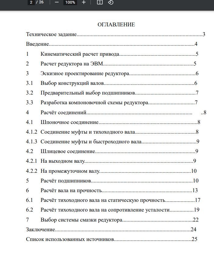 В результате проделанной работы спроектирован привод ленточного транспортёра с двухступенчатым цилиндрическим редуктором, приводным валом с барабаном. Разработаны чертеж общего вида привода, сборочный чертеж редуктора, чертежи вала, колеса и муфты, а также сборочный чертеж приводного вала. Рассчитан тихоходный вал на статическую и сопротивление усталости, рассчитаны подшипники на заданный ресурс, шпоночное и шлицевое соединения на прочность. Выполненные расчеты подтверждают надежность работы привода в течение 10000 часов.