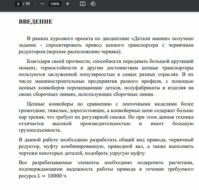 В рамках курсового проекта по дисциплине «Детали машин» получено задание - спроектировать привод цепного транспортера с червячным редуктором (верхнее расположение червяка). Благодаря своей прочности, способности передавать большой крутящий момент, термостойкости и другим достоинствам цепные транспортеры пользуются заслуженной популярностью в самых разных отраслях. В их числе машиностроительные предприятия разного профиля, с помощью цепных конвейеров перемещающие детали, полуфабрикаты и изделия на своих сборочных линиях, использующие сборочные линии. Цепные конвейеры по сравнению с ленточными моделями более громоздкие, тяжелые, дорогостоящие, а конвейерные цепи содержат больше пар трения, что требует их регулярной смазки. Но при этом данная техника отличается высокой производительностью и имеет большую грузоподъемность. В данной работе необходимо разработать общий вид привода, червячный редуктор, муфту комбинированную, приводной вал, а также выполнить чертежи некоторых деталей, подобрать упругую муфту. Все разрабатываемые элементы необходимо подкрепить расчетами, подтверждающими надежность работы привода в течении требуемого ресурса