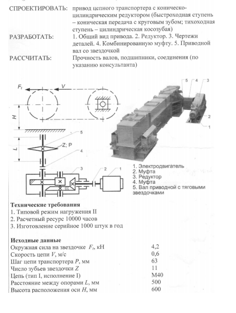 «Привод цепного транспортера с коническо-цилиндрическим редуктором (быстроходная ступень – коническая передача с круговым зубом, тихоходная ступень – цилиндрическая косозубая)»