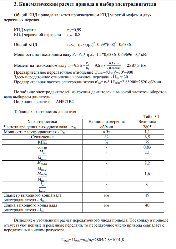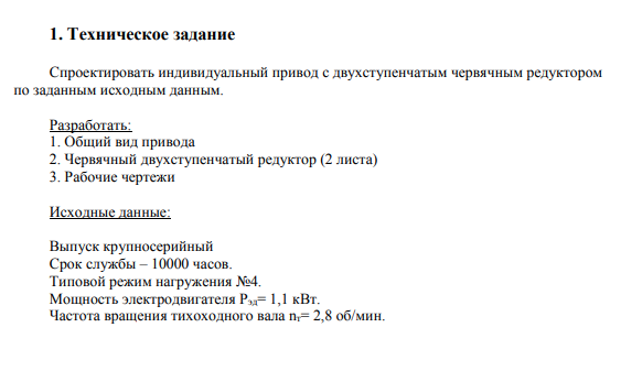 Спроектировать индивидуальный привод с двухступенчатым червячным редуктором по заданным исходным данным. Разработать: 1. Общий вид привода 2. Червячный двухступенчатый редуктор (2 листа) 3. Рабочие чертежи Исходные данные: Выпуск крупносерийный Срок службы – 10000 часов. Типовой режим нагружения №4. Мощность электродвигателя Рэд= 1,1 кВт. Частота вращения тихоходного вала nт= 2,8 об/мин.