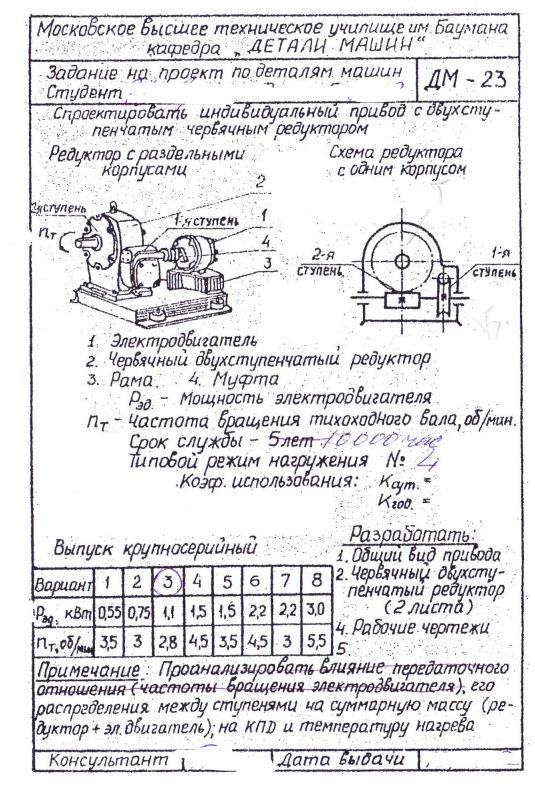 Для студентов МГТУ им. Н.Э.Баумана по предмету Детали машин (ДМ)ДМ 23 - Индивидуальный привод с двухступенчатым червячным редукторомДМ 23 - Индивидуальный привод с двухступенчатым червячным редуктором