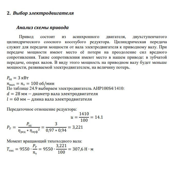 Анализ схемы привода Привод состоит из асинхронного двигателя, двухступенчатого цилиндрического соосного косозубого редуктора. Цилиндрическая передача служит для передачи мощности от вала электродвигателя к приводному валу. При передаче мощности имеют место её потери на преодоление сил вредного сопротивления. Такие сопротивления имеют место в нашем приводе: в зубчатой передаче, опорах валов. В виду этого мощность на приводном валу будет меньше мощности, развиваемой электродвигателем, на величину потерь.