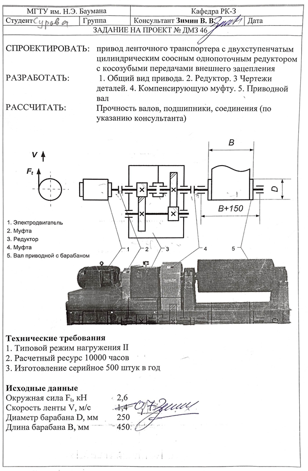 Для студентов МГТУ им. Н.Э.Баумана по предмету Детали машин (ДМ)Привод ленточного транспортера, редуктор цилиндрический двухступенчатый соосныйПривод ленточного транспортера, редуктор цилиндрический двухступенчатый соосный