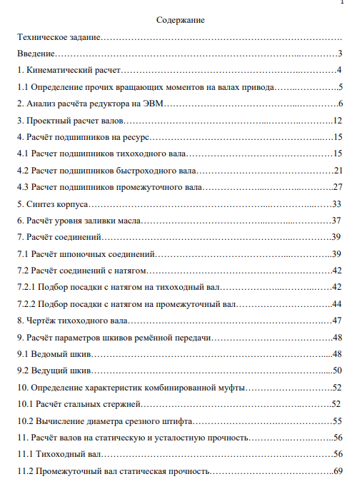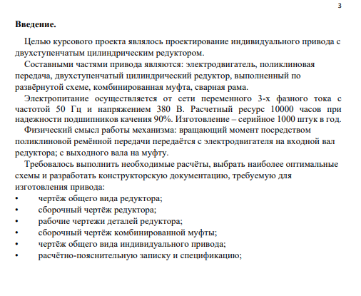 Целью курсового проекта являлось проектирование индивидуального привода с двухступенчатым цилиндрическим редуктором. Составными частями привода являются: электродвигатель, поликлиновая передача, двухступенчатый цилиндрический редуктор, выполненный по развёрнутой схеме, комбинированная муфта, сварная рама. Электропитание осуществляется от сети переменного 3-х фазного тока с частотой 50 Гц и напряжением 380 В. Расчетный ресурс 10000 часов при надежности подшипников качения 90%. Изготовление – серийное 1000 штук в год. Физический смысл работы механизма: вращающий момент посредством поликлиновой ремённой передачи передаётся с электродвигателя на входной вал редуктора; с выходного вала на муфту. Требовалось выполнить необходимые расчёты, выбрать наиболее оптимальные схемы и разработать конструкторскую документацию, требуемую для изготовления привода: • чертёж общего вида редуктора; • сборочный чертёж редуктора; • рабочие чертежи деталей редуктора; • сборочный чертёж комбинированной муфты; • чертёж общего вида индивидуального привода; • расчётно-пояснительную записку и спецификацию;