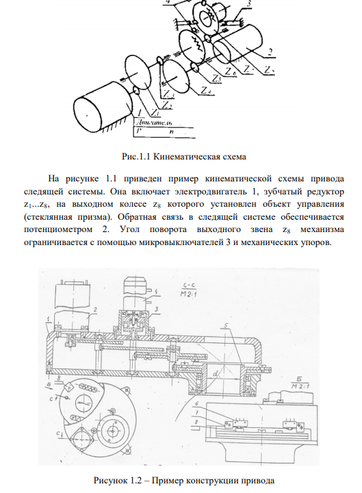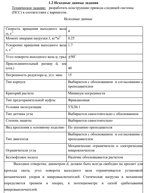 1.1 Введение Целью данного курсового проекта является разработка привода следящей системы. Процесс проектирования способствует творческому мышлению, способности самостоятельно принимать технически и экономически обоснованные конструкторские и объемно-планировочные решения. Нужно изучить техническое задание, прототипы изделия, выполнить расчеты и подготовить комплект чертежей.