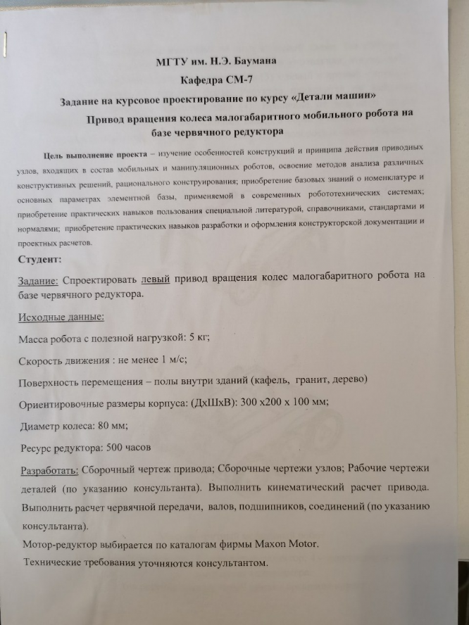 Для студентов МГТУ им. Н.Э.Баумана по предмету Детали машин (ДМ)Привод вращения колеса малогабаритного мобильного робота на базе червячного редуктора (для СМ7)Привод вращения колеса малогабаритного мобильного робота на базе червячного редуктора (для СМ7)