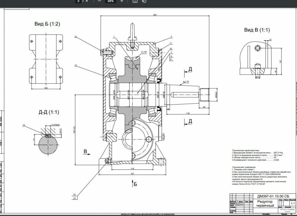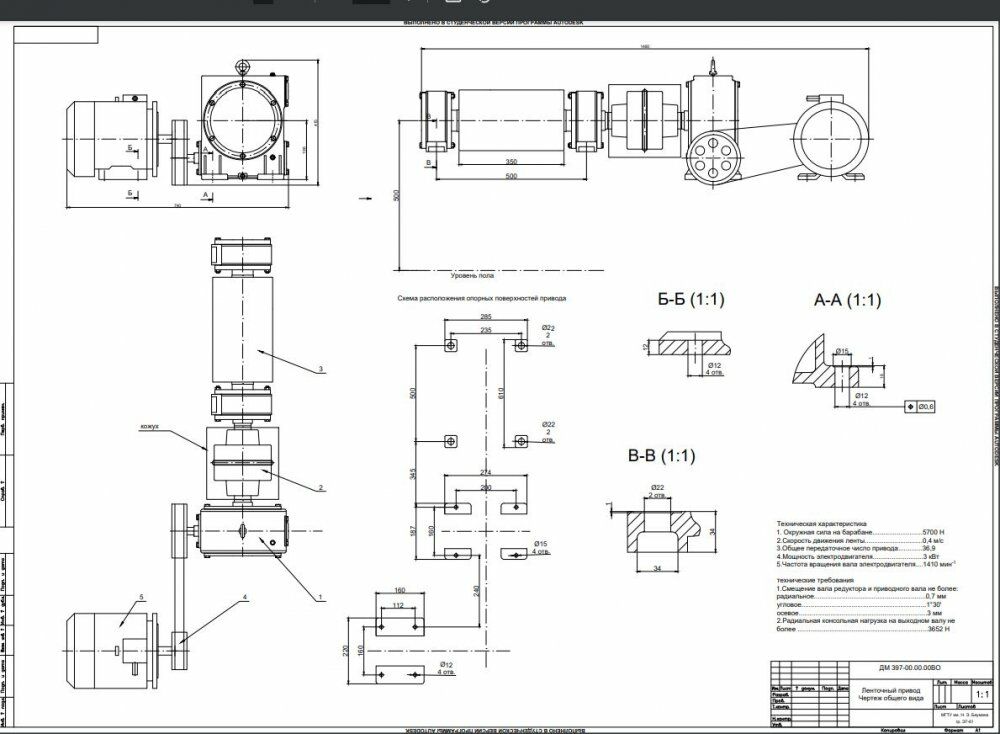 Для студентов МГТУ им. Н.Э.Баумана по предмету Детали машин (ДМ)ДМ 397 - Привод ленточного транспортера с червячным редуктором (с нижним расположением червяка) и ременной передачей от электродвигателя к редукторуДМ 397 - Привод ленточного транспортера с червячным редуктором (с нижним расположением червяка) и ременной передачей от электродвигателя к редуктору