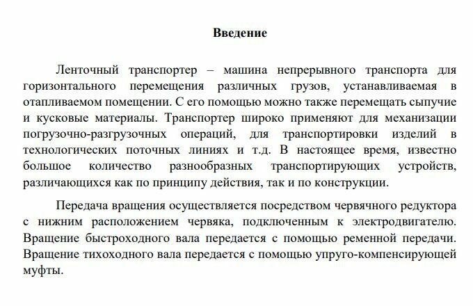 Ленточный транспортер – машина непрерывного транспорта для горизонтального перемещения различных грузов, устанавливаемая в отапливаемом помещении. С его помощью можно также перемещать сыпучие и кусковые материалы. Транспортер широко применяют для механизации погрузочно-разгрузочных операций, для транспортировки изделий в технологических поточных линиях и т.д. В настоящее время, известно большое количество разнообразных транспортирующих устройств, различающихся как по принципу действия, так и по конструкции. Передача вращения осуществляется посредством червячного редуктора с нижним расположением червяка, подключенным к электродвигателю. Вращение быстроходного вала передается с помощью ременной передачи. Вращение тихоходного вала передается с помощью упруго-компенсирующей муфты.