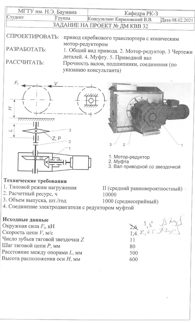 Для студентов МГТУ им. Н.Э.Баумана по предмету Детали машин (ДМ)Привод скребкового транспортера с коническим мотор-редукторомПривод скребкового транспортера с коническим мотор-редуктором