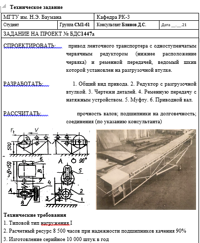 Для студентов МГТУ им. Н.Э.Баумана по предмету Детали машин (ДМ)Вариант БДС1447а - Курсовой проект "Привод ленточного транспортера"Вариант БДС1447а - Курсовой проект "Привод ленточного транспортера"