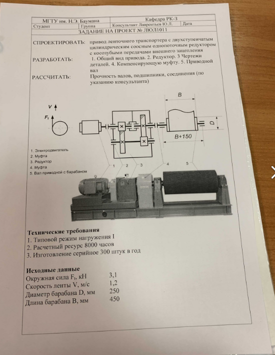 Для студентов МГТУ им. Н.Э.Баумана по предмету Детали машин (ДМ)Привод ленточного транспортёра с двухступенчатым цилиндрическим соосным однопоточным редуктором с косозубыми передачами внешнего зацепленияПривод ленточного транспортёра с двухступенчатым цилиндрическим соосным однопоточным редуктором с косозубыми передачами внешнего зацепления