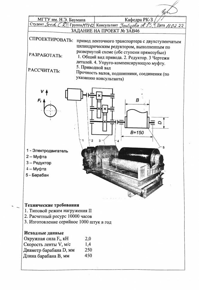 Требуется спроектировать привод ленточного транспортера с двухступенчатым цилиндрическим редуктором с прямозубыми ступенями; разработать общий вид привода, редуктор, чертежи деталей, компенсирующую муфту, приводной вал; рассчитать прочность валов, подшипников и соединений (по указанию консультанта).