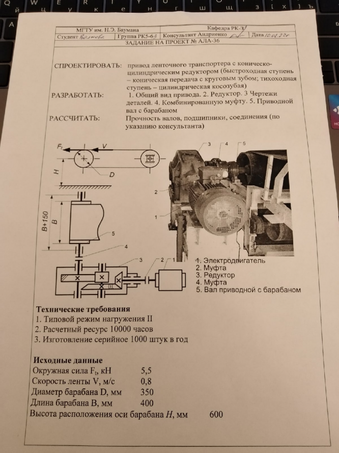 Для студентов МГТУ им. Н.Э.Баумана по предмету Детали машин (ДМ)Привод ленточного транспортёра с коническо-цилиндрическим редукторомПривод ленточного транспортёра с коническо-цилиндрическим редуктором