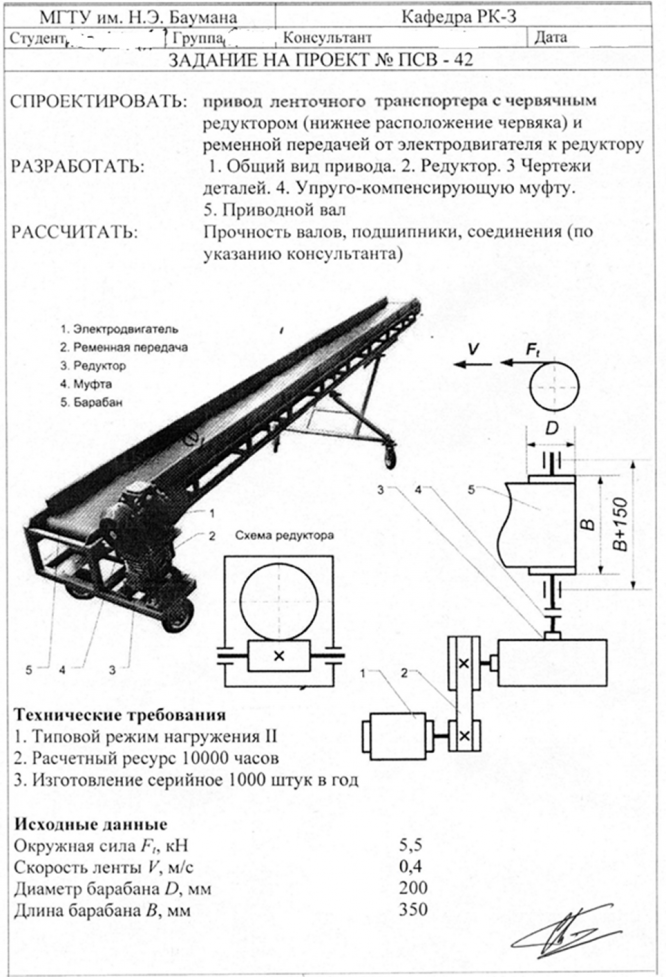 Курсовая работа ПСВ: Проектирование привода ленточного транспортера с червячным редуктором (ПСВ-42) вариант 42