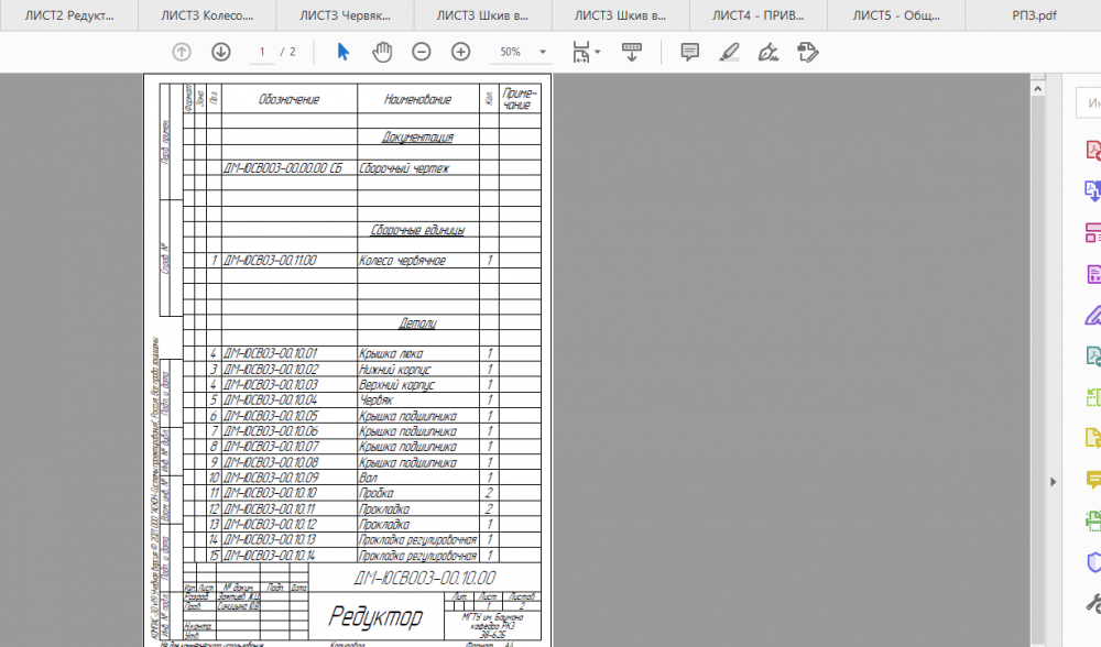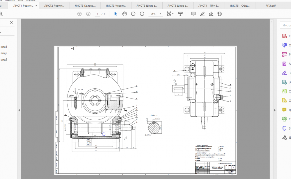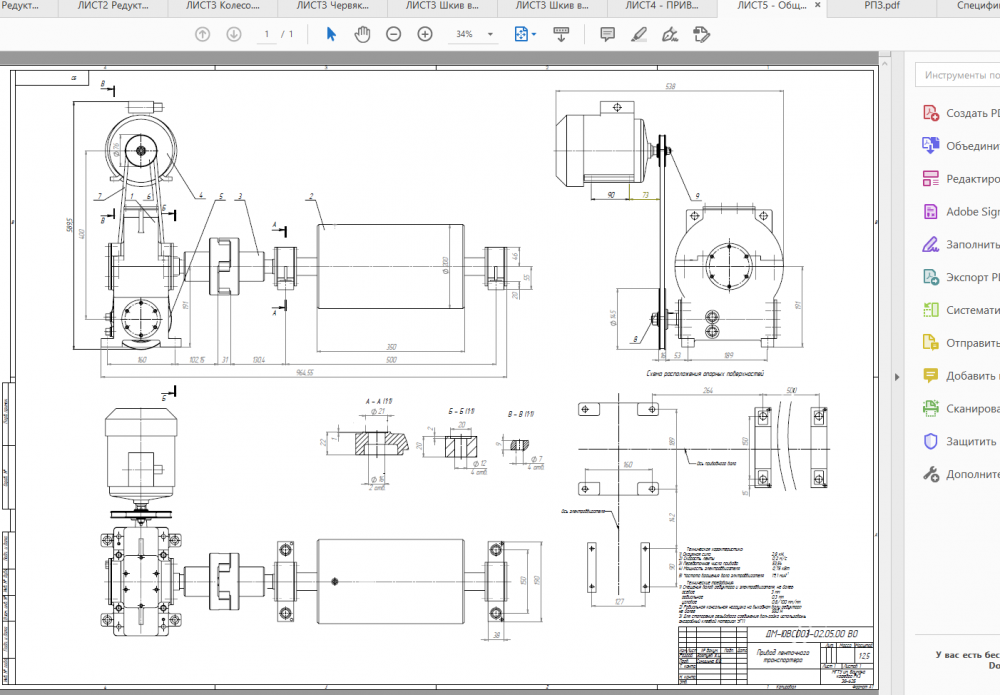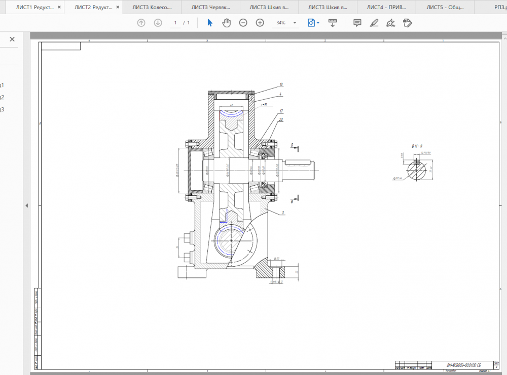 Привод ленточного транспортера - Червячный редуктор ЮСВ 3 \"Привод ленточного транспортера - Червячный редуктор\" Все чертежи, спецификации и РПЗ в формате ПДФ ДМ-ЮСВ003 Препод Синицына Ю.В. .