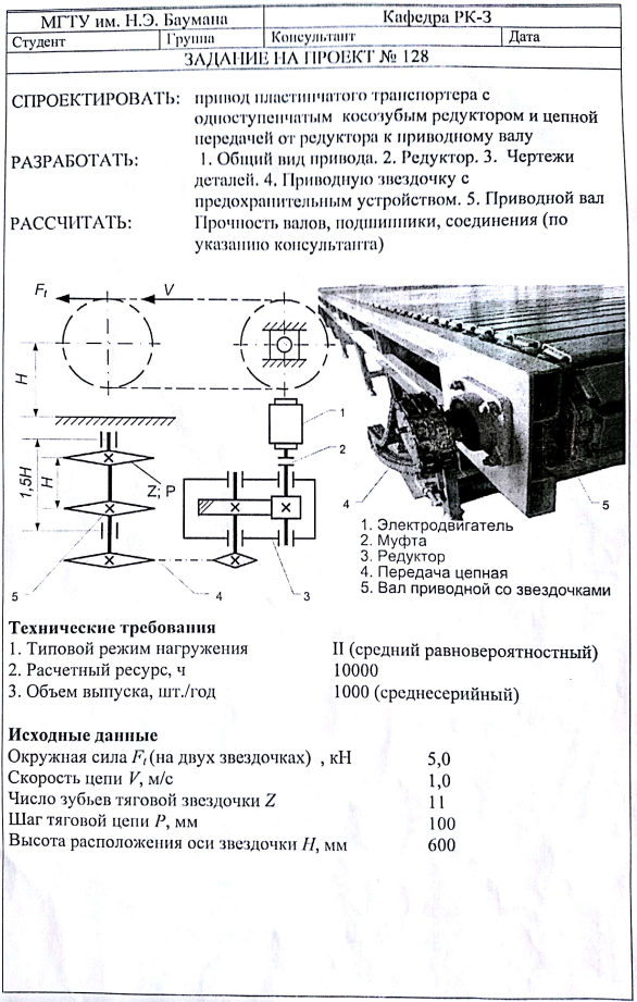 Для студентов МГТУ им. Н.Э.Баумана по предмету Детали машин (ДМ)Привод пластинчатого транспортера с одноступенчатым косозубым редуктором и цепной передачей от редуктора к приводному валуПривод пластинчатого транспортера с одноступенчатым косозубым редуктором и цепной передачей от редуктора к приводному валу