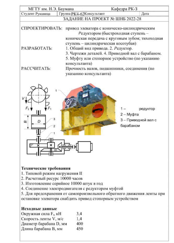 Для студентов МГТУ им. Н.Э.Баумана по предмету Детали машин (ДМ)Привод элеватора с коническо-цилиндрическим мотор-редукторомПривод элеватора с коническо-цилиндрическим мотор-редуктором