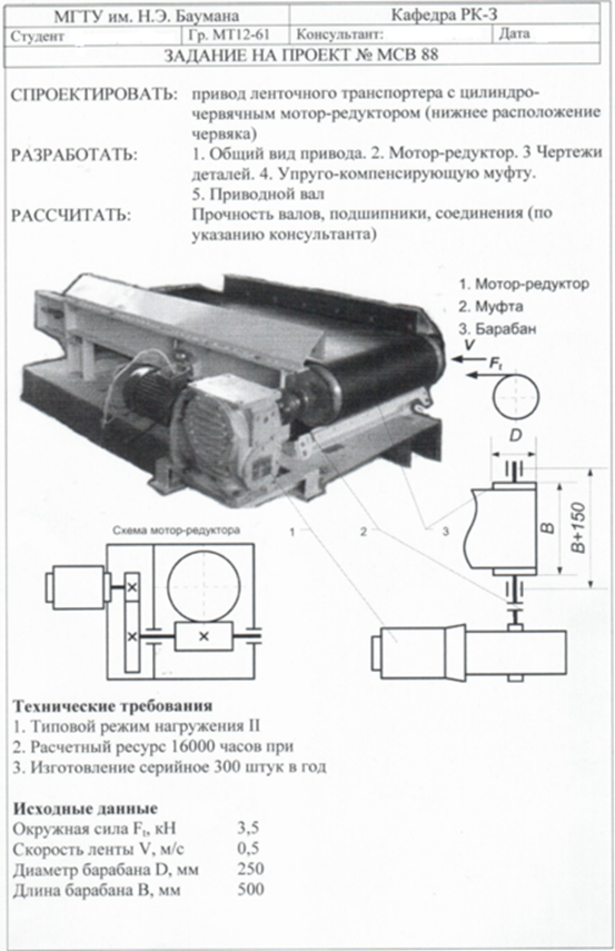 Для студентов МГТУ им. Н.Э.Баумана по предмету Детали машин (ДМ)Привод ленточного транспортера с цилиндро-червячным мотор-редукторомПривод ленточного транспортера с цилиндро-червячным мотор-редуктором