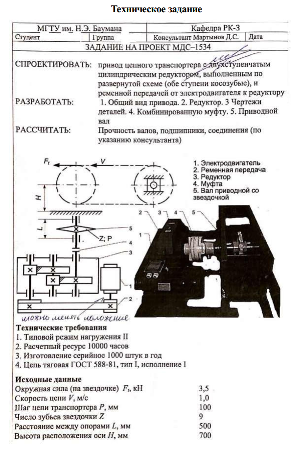 Главная » Учебные материалы » Детали машин (ДМ) » Курсовые работы » МГТУ им. Н.Э.Баумана » 6 семестр » Номер МДС » Вариант 1534 » Привод цепного транспортера с двухступенчатым цилиндрическим редуктором, выполненным по развернутой схеме (обе ступени косозубые), и ременной передачей от электродвигателя к редуктору