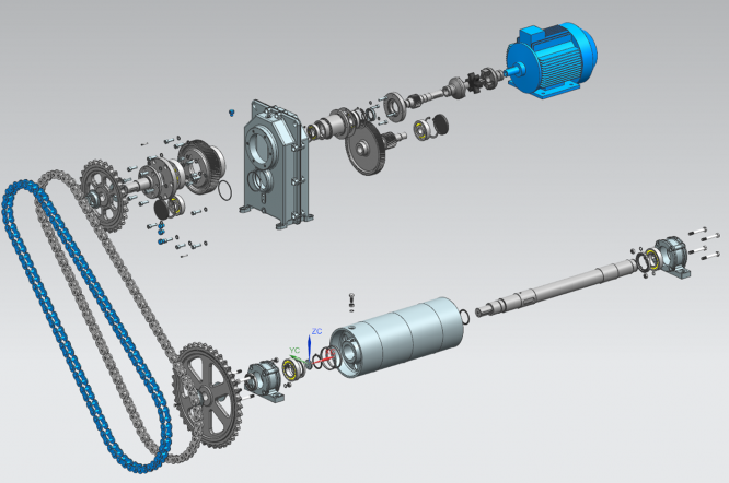 Для студентов МГТУ им. Н.Э.Баумана по предмету Детали машин (ДМ)Привод ленточного транспортера с двухступенчатым цилиндрическим косозубым вертикальным соосным однопоточным мотор-редуктором и цепно передачей от редуПривод ленточного транспортера с двухступенчатым цилиндрическим косозубым вертикальным соосным однопоточным мотор-редуктором и цепно передачей от реду