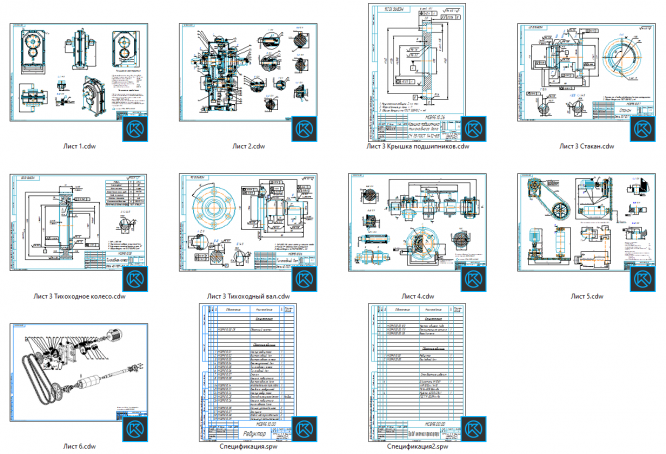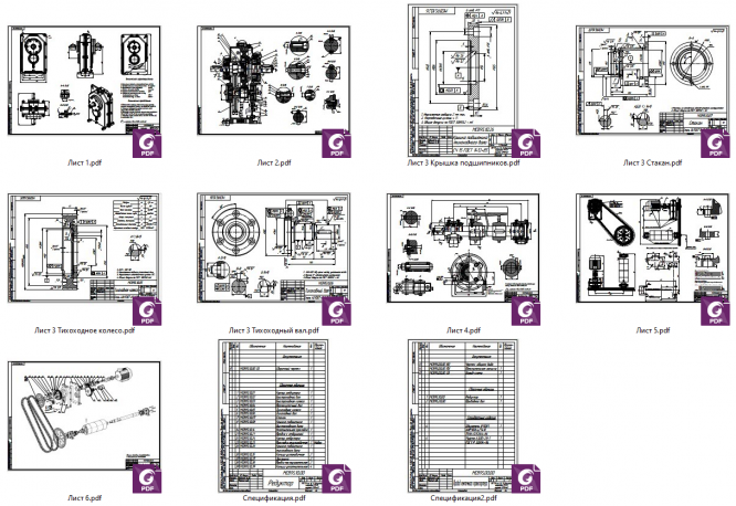 • Лист 4: Рабочие чертежи "Крышка подшипников + Стакан + Тихоходное колесо + Тихоходный вал"