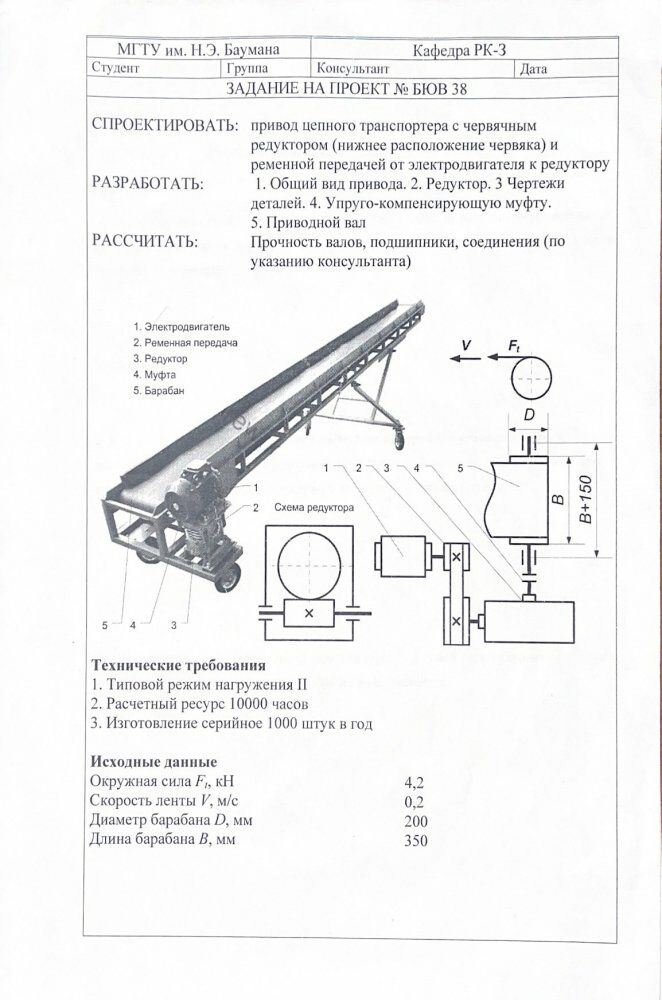 Для студентов МГТУ им. Н.Э.Баумана по предмету Детали машин (ДМ)Привод цепного транспортера с червячным редуктором (нижнее расположение червяка) и ременной передачей от электродвигателя к редукторуПривод цепного транспортера с червячным редуктором (нижнее расположение червяка) и ременной передачей от электродвигателя к редуктору