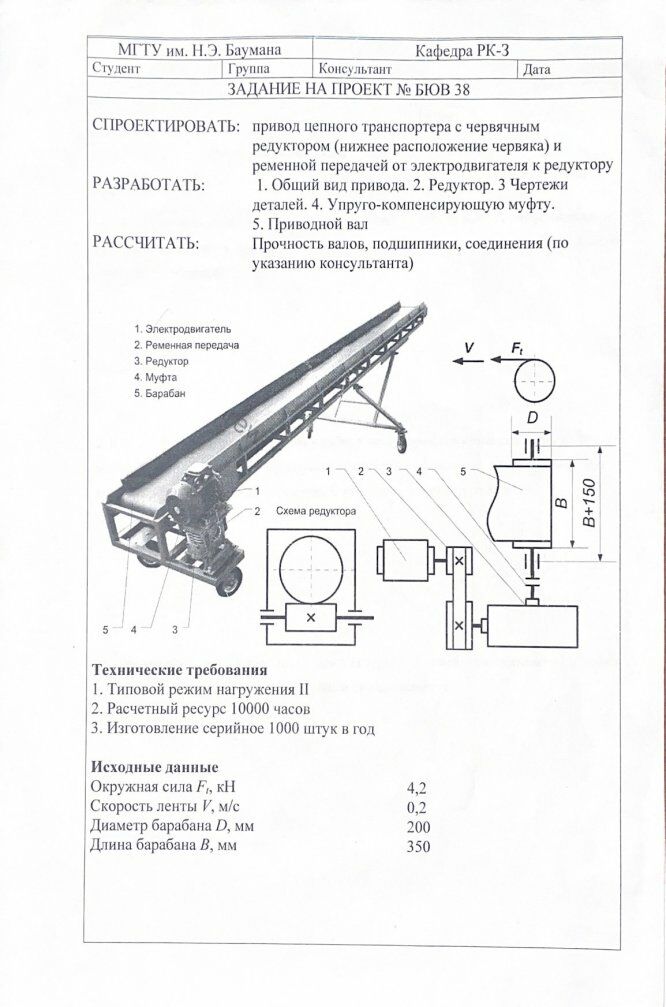 БЮВ №38. Привод цепного транспортера с червячным редуктором (нижнее расположение червяка) и ременной передачей от электродвигателя к редуктору