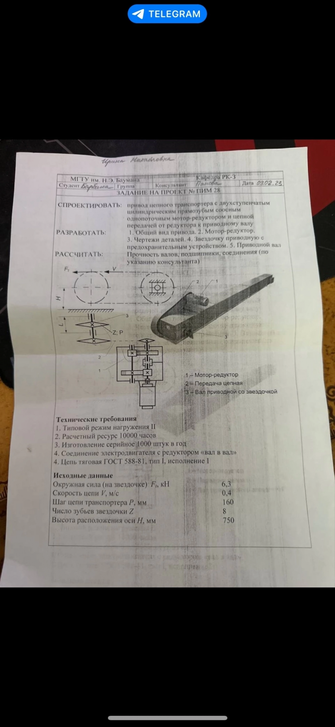 Для студентов МГТУ им. Н.Э.Баумана по предмету Детали машин (ДМ)привод цепного транспортёра с двухступенчатым цилиндрическим прямозубым соосным однопоточным мотор-редуктором и цепной передачей от редуктора к приводпривод цепного транспортёра с двухступенчатым цилиндрическим прямозубым соосным однопоточным мотор-редуктором и цепной передачей от редуктора к привод