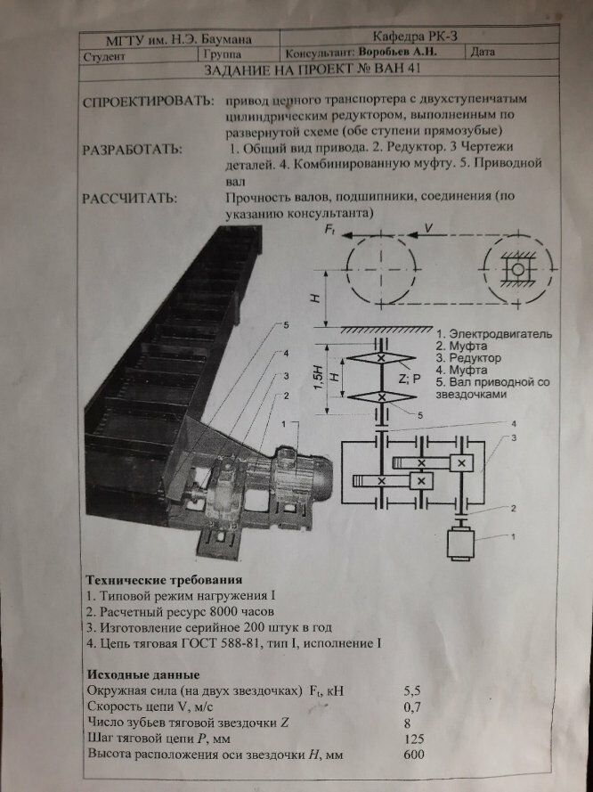 Для студентов МГТУ им. Н.Э.Баумана по предмету Детали машин (ДМ)Привод цепного транспортера с двухступенчатым цилиндрическим редуктором, выполненным по развернутой схеме ВАН-41Привод цепного транспортера с двухступенчатым цилиндрическим редуктором, выполненным по развернутой схеме ВАН-41