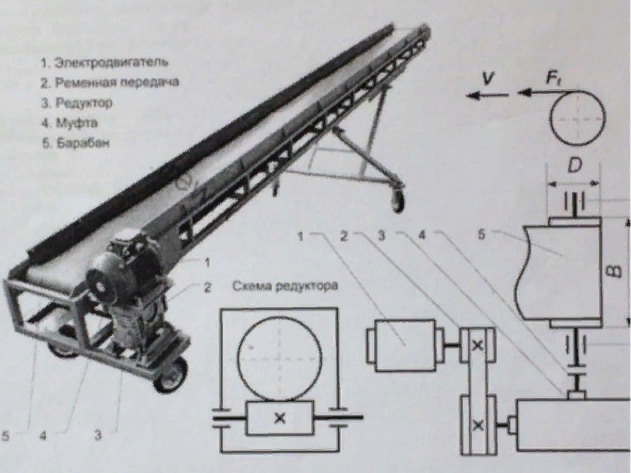 Привод ленточного транспортера с червячным редуктором (нижее расположение червяка) и ременной передачей от электродвигателя к редуктору