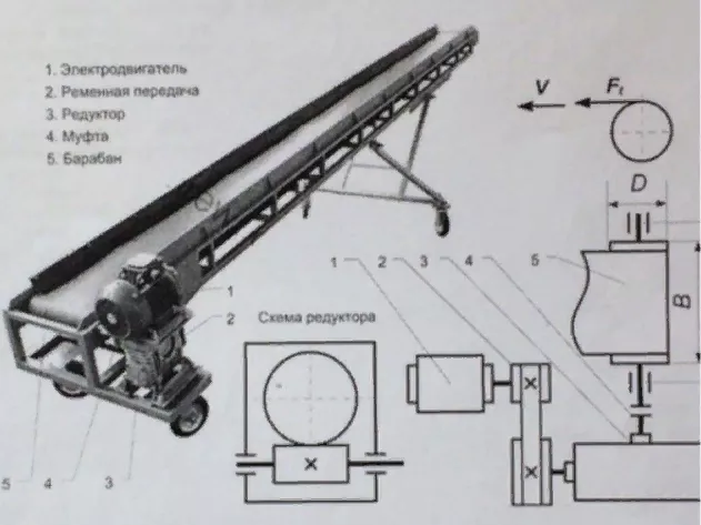 Привод ленточного транспортера с червячным редуктором (нижее расположение червяка) и ременной передачей от электродвигателя к редуктору